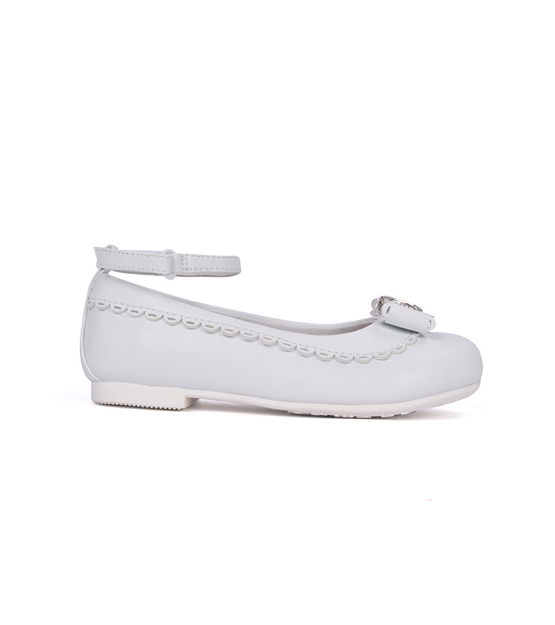 美しいリボンとスカラップエッジをあしらったガールズバレエシューズで、フォーマルイベントから普段使いまで幅広く活躍します。
