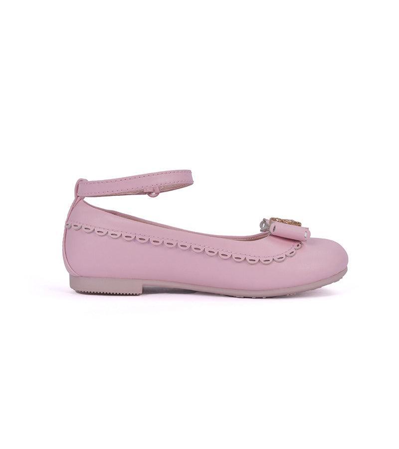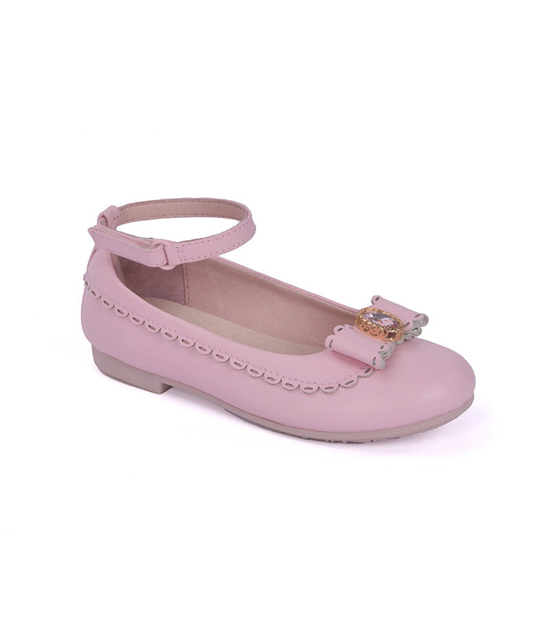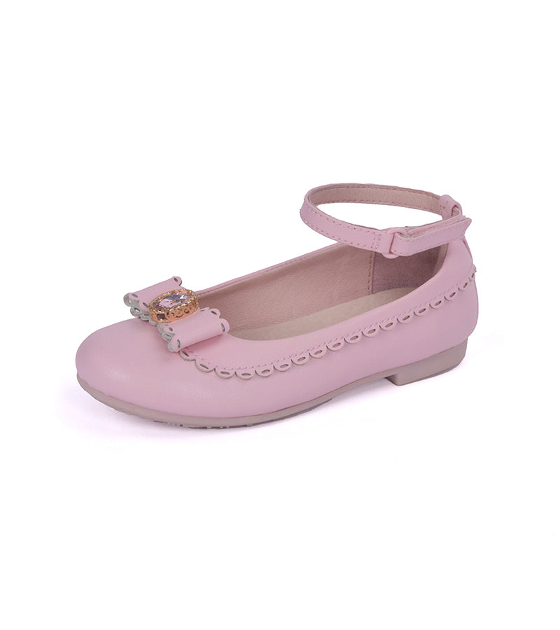 美しいリボンとスカラップエッジをあしらったガールズバレエシューズで、フォーマルイベントから普段使いまで幅広く活躍します。