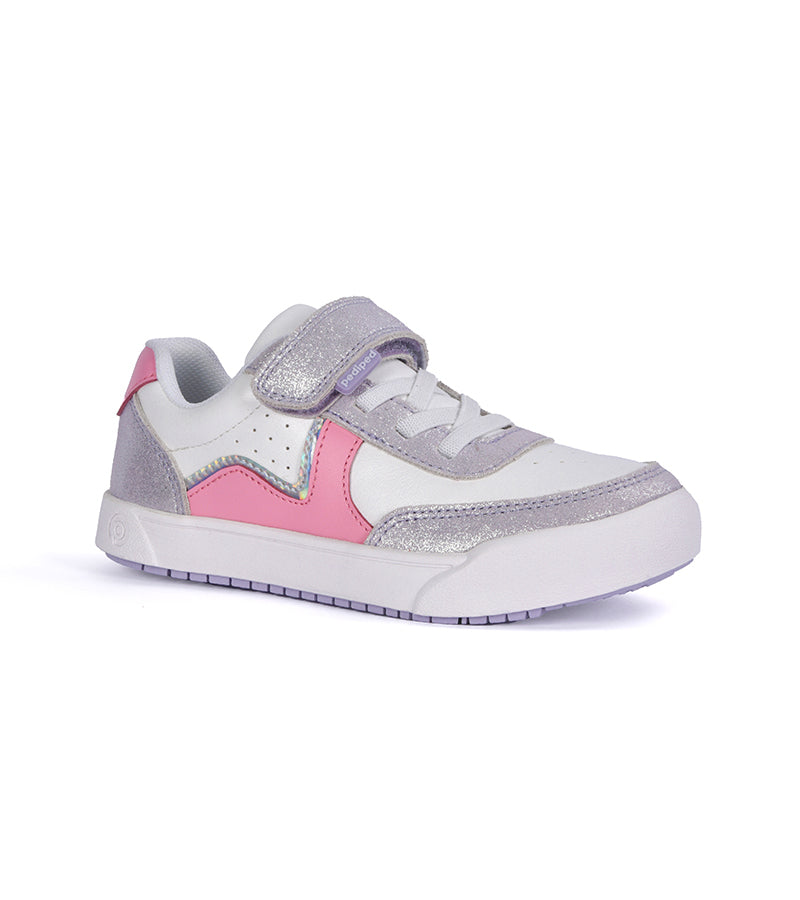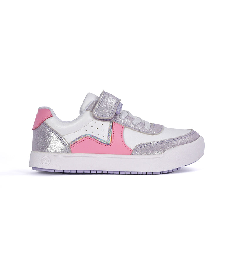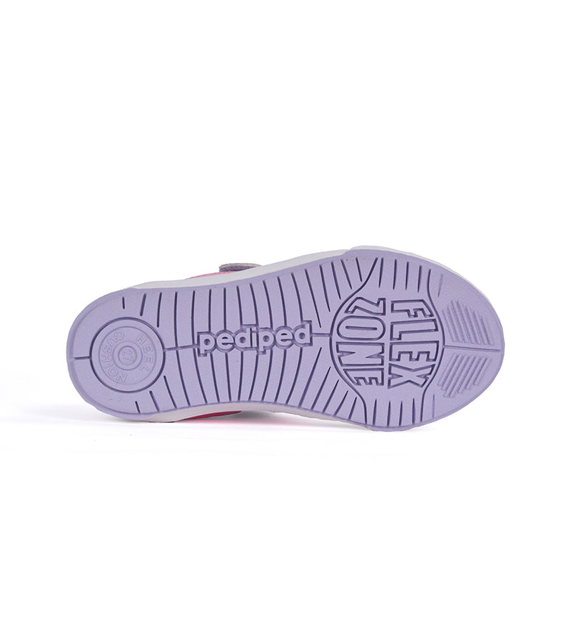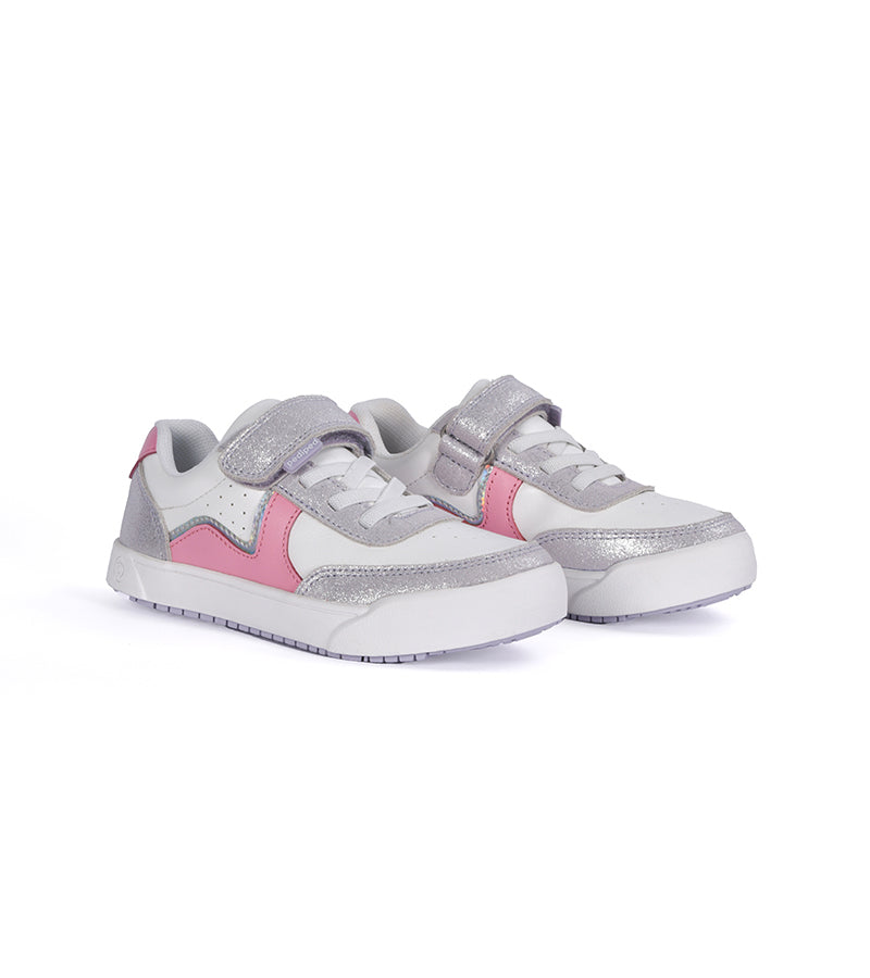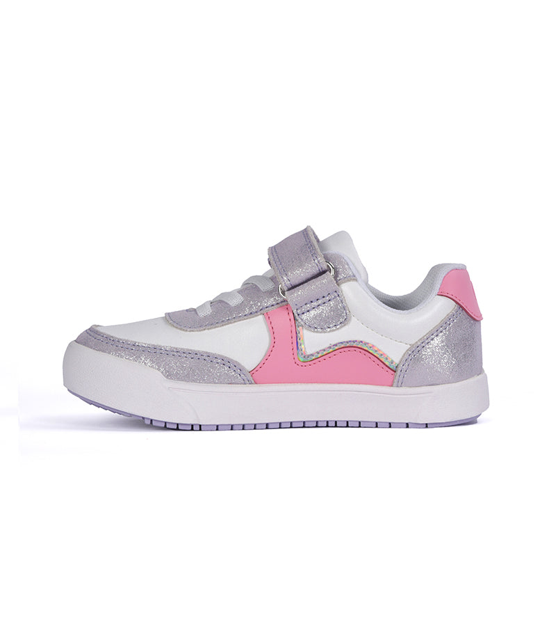 ピンクとパープルの2色展開で、普段使い、通園・通学、遊びにもぴったりのファッショナブルなキッズシューズです。"